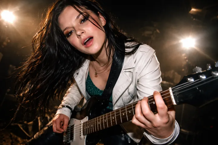 Красивая девушка играет на электрогитаре