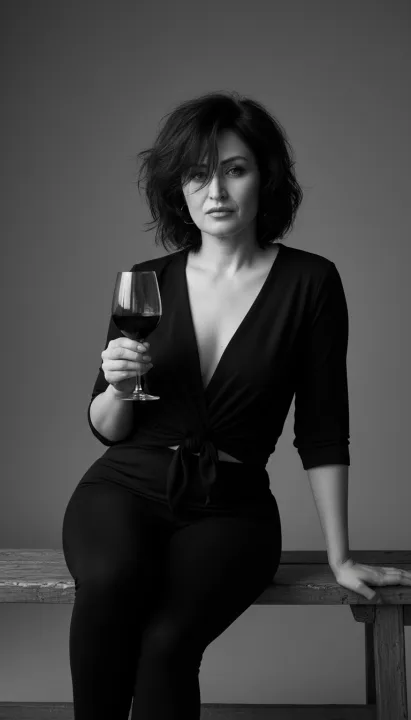 Черно-белое фото женщины с бокалом в руке