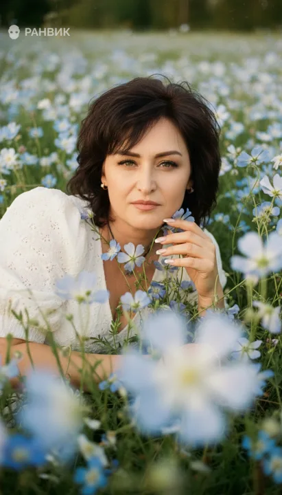 Фото девушки в полевых цветах голубого цвета