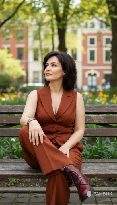 Фото девушки в парке на лавочке в оранжевом костюме