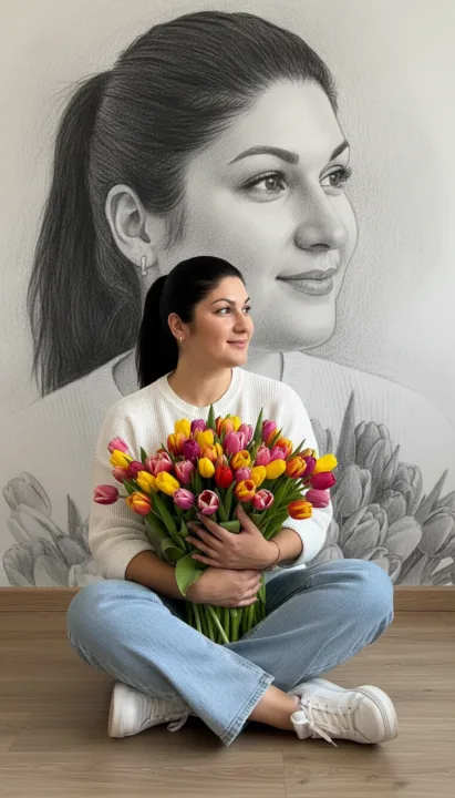 Фотосессия девушки с тюльпанами с портретом на стене