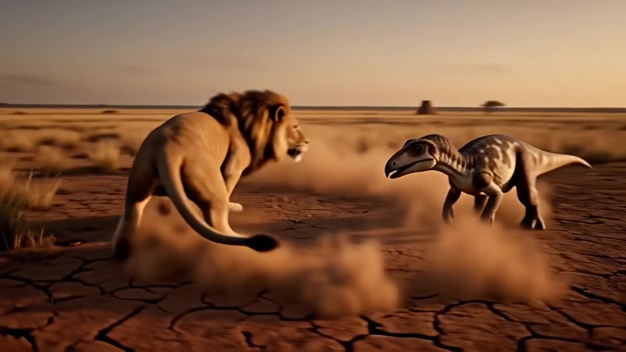 Love Modern 27.01.2026 22:52 Промпты для видео Лев против динозавра Aquilops 6 секунд эпичной схватки