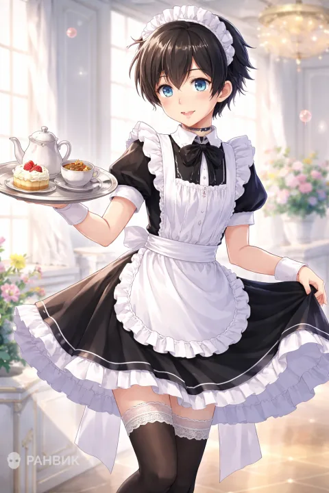 Арт аниме девочки в костюме горничной передает атмосферу уютного кафе: короткие темные волосы, большие голубые глаза и классическое черно-белое платье с фартуком, кружевами и бантиком. В кадре важны детали сервировки: поднос с десертом и чашкой чая помогает сразу задать сюжет и настроение.