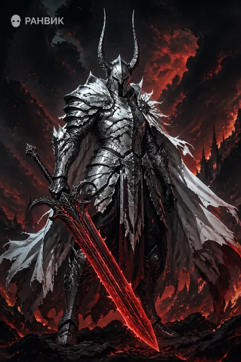 Арт рыцаря-демона с мечом на фоне темного неба - иллюстрация с мощной драматургией, где герой читается с первого взгляда: массивные серебристые доспехи с черными трещинами, шлем с двумя длинными рогами и белый рваный плащ создают ощущение древнего проклятия и несокрушимой воли.