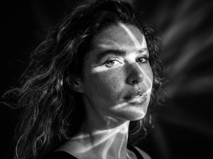 Ключевой прием — преломленные солнечные лучи, распадающиеся на диагональные мерцающие полосы, словно свет скользит по коже из подводной среды. Монохром держится на экстремально высоком контрасте, а намеренная зернистость имитирует тонкую пленочную текстуру и добавляет телесности деталям — веснушкам, губам, взгляду.