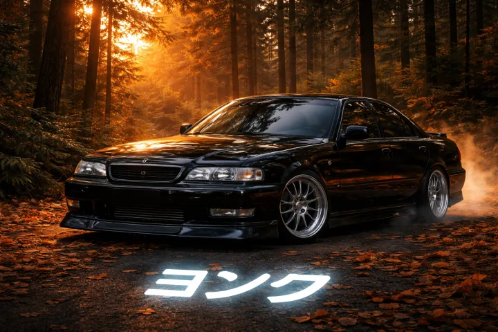 Машина: Твоя черная Toyota Cresta JZX93 стоит в центре композиции, слегка развернутая к зрителю. Она выглядит монументально. Кузов идеально черный, глянцевый, в нем отражаются стволы деревьев и оранжевое небо. Диски (серебристые, многоспицевые) блестят. Видны детали: агрессивный передний бампер, возможно, легкий тюнинг подвески (она стоит низко, но клиренс позволяет быть в лесу).