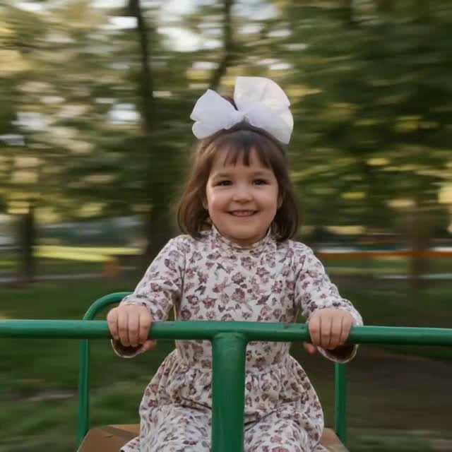 Девочка на карусели реалистичное видео передает живую эмоцию и точную схожесть с исходным образом: лицо, пропорции, одежда и фактура кожи сохранены без изменений. Кинематографичный реализм усиливает ощущение присутствия, а теплое настроение делает сцену по-настоящему радостной.