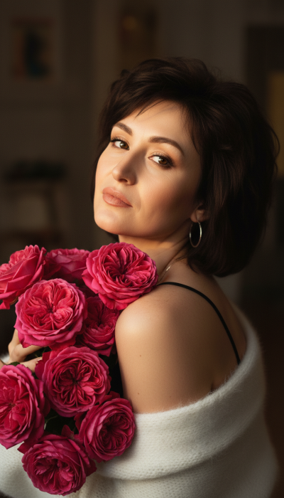 Выразительный крупный план 9:16 с плотным кадрированием и акцентом на эмоции. В основе лежит портретная оптика 85 мм с диафрагмой f/1.8: малая глубина резкости оставляет резкими глаза и фактуру садовых роз, а фон растворяется в мягком кремовом боке.