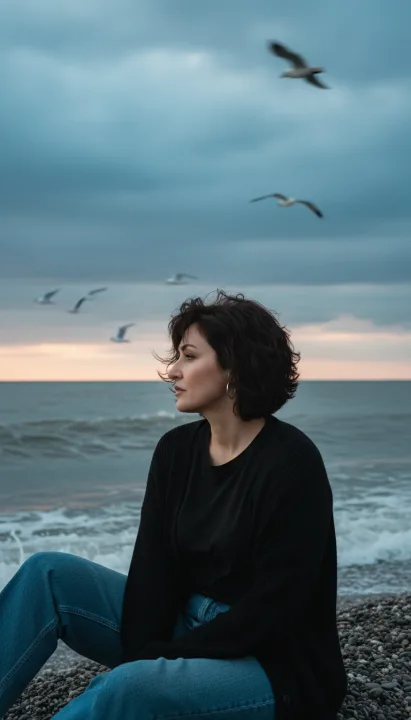 Мягкий контраст, матовые тени и легкая приглушенность цвета работают на спокойную, редакционную подачу. Чайки в небе с легким смазом движения добавляют ощущение ветра и живого момента, а пряди волос частично перекрывают лицо, усиливая естественность.