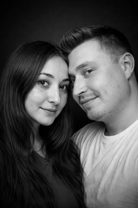 Композиция «лицом к лицу» усиливает контакт и делает кадр камерным, а монохромный фон подчеркивает объем и контраст. Достаточно ровного света без жестких теней, чтобы сохранить естественность и аккуратно выделить глаза и контуры.
