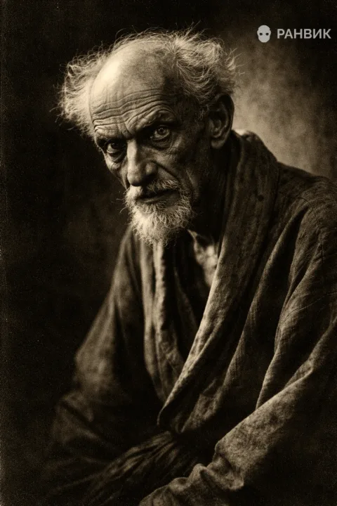 Фото Плюшкина в стиле кино с мрачной атмосферой передает характер через фактуру и свет: крупный план, костистый подбородок, живые бегающие глаза и изношенный халат читаются без лишних деталей. Такой образ легко использовать как референс для иллюстрации, обложки или учебного разбора выразительного портрета.