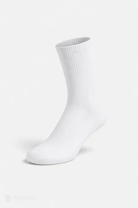 Ровное освещение подчеркивает белый цвет без пересветов, а мягкая тень добавляет объем и отделяет носок от фона. Высокая детализация делает заметными вязку и плотность материала, что особенно ценно для карточек товаров и каталогов.
