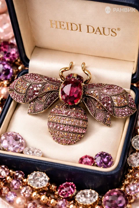 Фото броши из камней в виде пчелы раскрывает ювелирную выразительность бренда Heidi Daus: пчела с крупным красным камнем и россыпью розовых и прозрачных кристаллов в золотых деталях. Макросьемка под мягким студийным светом подчеркивает блеск граней и чистоту отражений, сохраняя премиальный характер композиции.