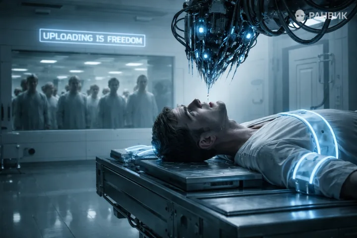 Фото человека на столе под роботизированной рукой показывает стерильную белую камеру преобразования 2037 года, где тело зафиксировано светящимися синими энергетическими связками. Холодное сине-белое, кинематографическое освещение подчеркивает клинический ужас и делает кадр почти осязаемым.