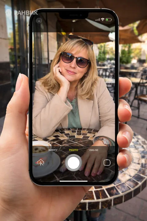 Фото через телефон женщины в кафе - фешн-лайфстайл кадр с экстремальной перспективой, где смартфон доминирует на переднем плане и заполняет большую часть композиции. Внутри экрана - портрет женщины за столиком на открытой террасе с каменными стенами и металлическими стульями: бежевое пальто, темные брюки, овальные солнцезащитные очки, расслабленная поза с опорой на руку.