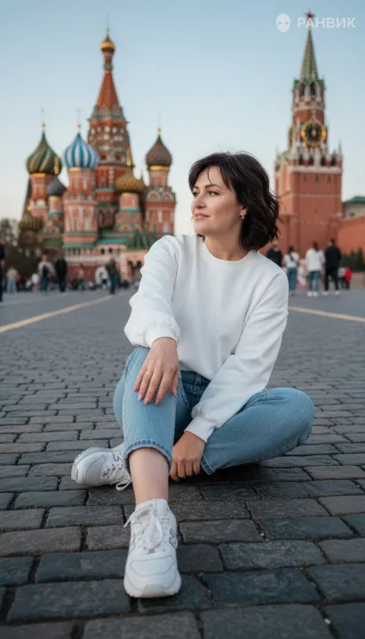 Фото девушки на Красной площади летом - спокойный уличный портрет с акцентом на живую позу и атмосферу Москвы в вечерние часы. Вертикальный формат 9:16 и съемка с уровня земли с легким наклоном вверх усиливают перспективу брусчатки и делают кадр более объемным.