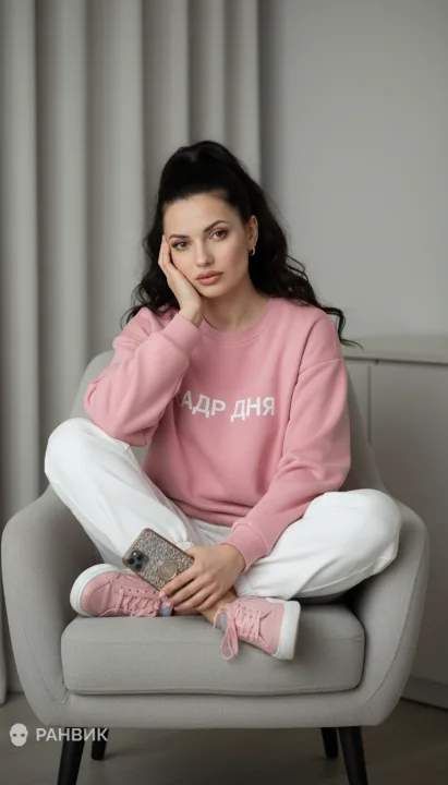 Девушка в кадре передает домашний уют и легкую задумчивость: поза по-турецки на кресле, спокойный взгляд и собранные в высокий хвост волосы создают ощущение тишины и личного пространства. Образ построен на пастельных оттенках, где розовый свитшот «КАДР ДНЯ» и белые брюки выглядят чисто и современно.