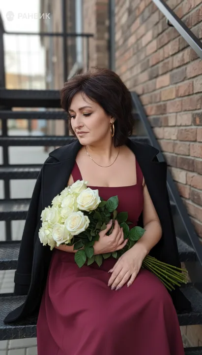 Фото девушки с розами в платье на лестнице передает спокойную городскую романтику: молодая женщина в бордовом сарафане сидит на черной металлической лестнице у фактурной кирпичной стены и держит букет белых роз. Композиция построена на полупрофиле и мягком жесте рук, чтобы внимание оставалось на выражении лица и текстуре лепестков.