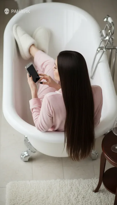 Розовая пижама, белые пушистые тапочки, аккуратный черный маникюр и тонкое кольцо - опорные элементы, которые добавляют правдоподобие и собирают образ в цельную историю релакса. Приглушенная цветовая гамма удерживает внимание на лице, руках и гаджете без лишнего шума.