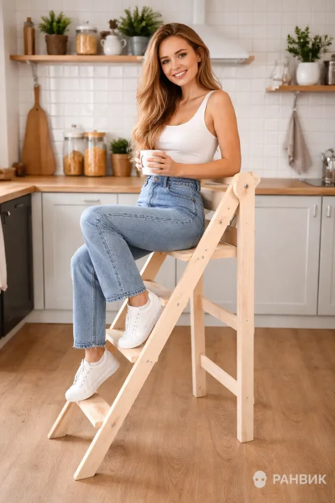 Фото девушки на кухне в джинсах на стремянке-табурете передает живую домашнюю сцену: полный рост, реалистичная подача и высокая детализация делают кадр убедительным для каталога, блога или рекламной задачи. В основе результата - точно настроенный промпт с акцентом на мягкий естественный свет и уютную светлую кухню с деревянным полом и полками с растениями.