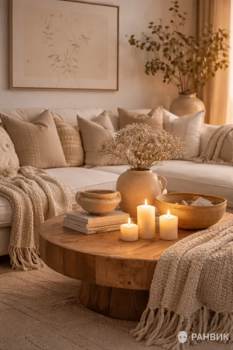 Угловой диван с подушками и вязаными пледами задает ощущение уюта без перегруза. Круглый низкий деревянный столик работает как центр композиции: на нем уместны книги, свечи и керамическая ваза с гипсофилой - простой набор, который выглядит цельно.