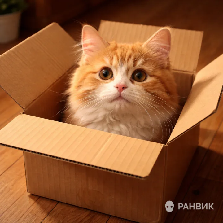Малая глубина резкости аккуратно отделяет кота от фона, усиливая ощущение присутствия. Деревянный пол и картонная коробка добавляют фактуру и понятный сюжет: простая вещь превращается в любимое место.