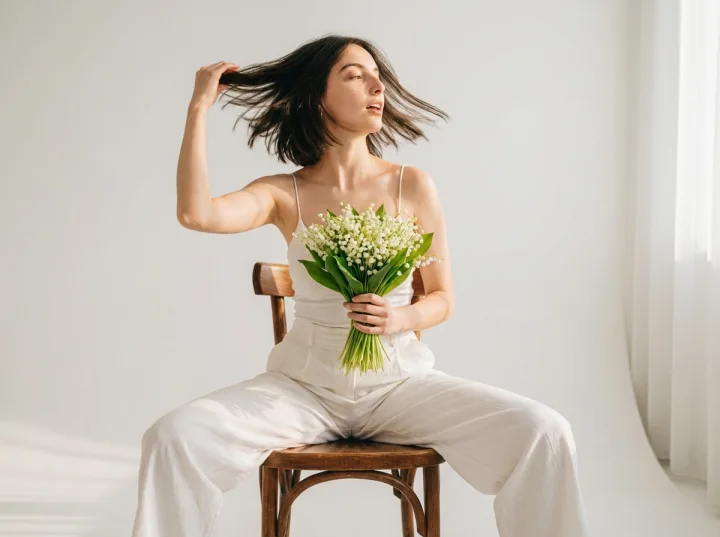 Фото красивой девушки с ландышами в студии - это пример того, как минимализм в кадре усиливает эмоцию. Белый фон и мягкое боковое освещение от окна дают чистые полутона, подчеркивают фактуру кожи и белую ткань, а букет ландышей становится точкой притяжения взгляда.