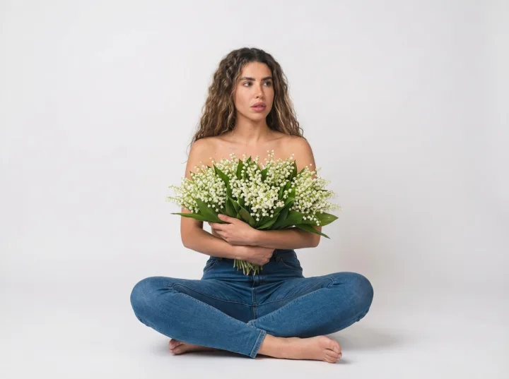 Фото красивой девушки с ландышами в студии - наглядный пример того, как белый студийный фон и мягкое студийное освещение создают чистую, дорогую картинку без лишних деталей. Расслабленная поза с поджатыми ногами, взгляд в сторону и слегка приоткрытые губы дают ощущение живого момента, а крупный букет ландышей становится главным визуальным акцентом и одновременно деликатной линией композиции.