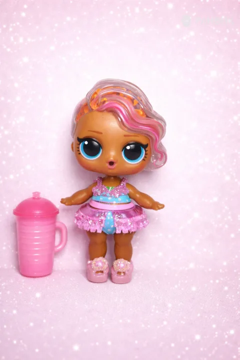 Кукла притягивает взгляд большими голубыми глазами и сияющим розоватым нарядом: образ читается мгновенно и отлично подходит для витрин, карточек товара и коллекционных подборок.