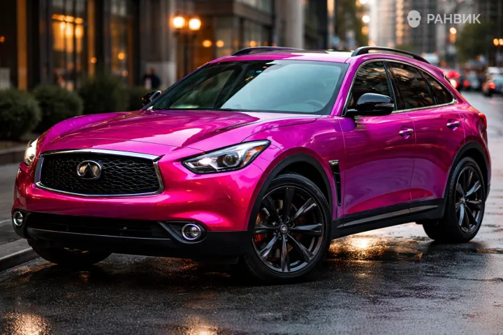 Фото машины Infiniti в розовом цвете показывает, как премиальный кроссовер раскрывается в сложном перламутре: базовый слой опирается на фирменный красный оттенок Mazda, а внешний слой уходит в насыщенный Ruby Stone. В результате кузов играет от малинового к фуксии, оставаясь глубоким и «живым» при любом угле обзора.