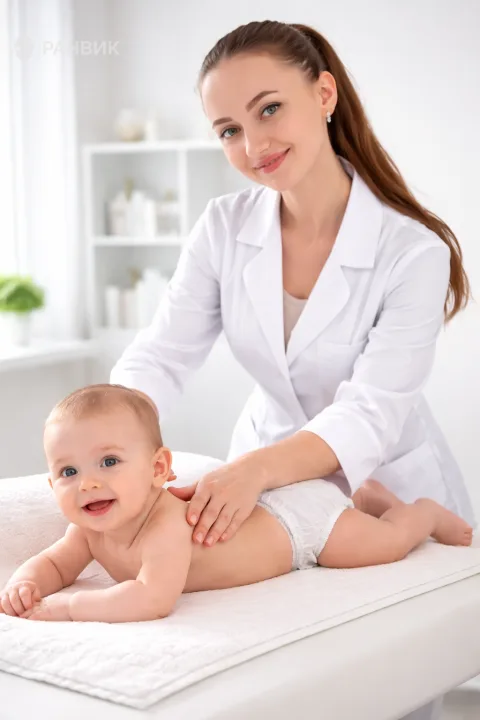 Фото массажиста в кабинете с ребенком показывает аккуратную медицинскую практику: специалист в белом халате, волосы собраны в хвост, проводит массаж малышу 6 месяцев на кушетке в светлом, белом кабинете. Такой визуальный образ помогает быстро передать доверие, стерильность и заботу.