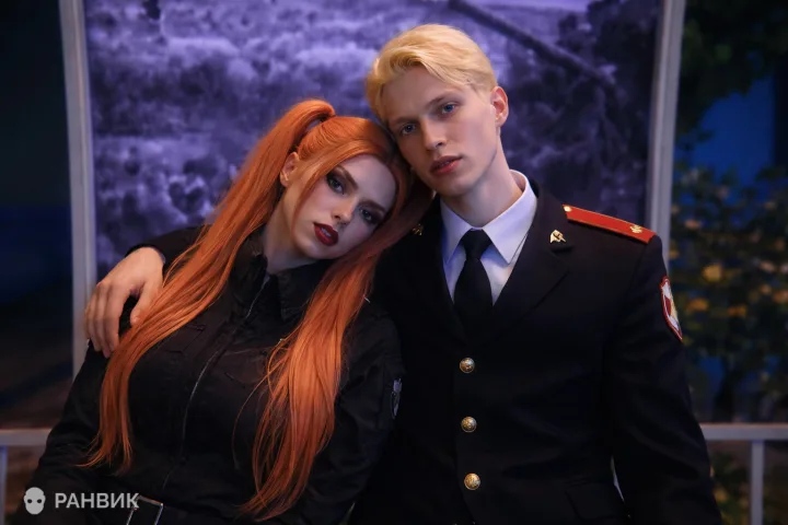 Мягкий сине-фиолетовый свет выстраивает обьем и подчеркивает контраст темной парадной формы и медно-рыжих волос. Такое освещение задает романтичную, немного меланхоличную атмосферу и аккуратно отделяет фигуры от фона у большого окна.