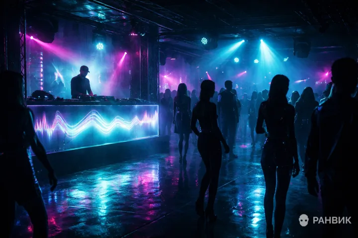 Фото ночного клуба с посетителями на танцполе передает плотную энергетику мелодичного техно: полумрак, дымка и неоново-голубые с пурпурными отблесками на полированном бетоне создают кинематографическое настроение.