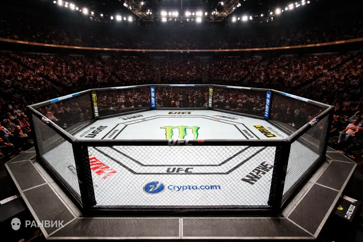 Фото октагона с полными трибунами передает масштаб арены: клетка в центре, полный зал и ощущение большого турнира еще до выхода спортсменов. Такой кадр подходит для афиш, новостных материалов и оформления спортивных сообществ, когда важна энергия события без лишних деталей.