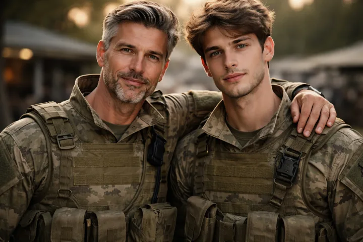 Фотореалистичный портрет о поддержке, гордости и связи поколений, где важны мимика, узнаваемость и спокойная уверенность взглядов. В основе работы - точный промпт, который сохраняет черты лица и добавляет современную военную экипировку без лишней символики.
