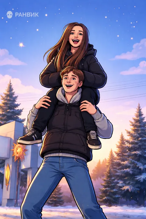Генерация помогает превратить живой кадр в выразительную иллюстрацию, не теряя эмоции и узнаваемость. В основе результата - сохраненная поза и композиция: парень несет девушку на плечах, оба улыбаются, а фон передает зимнее настроение.