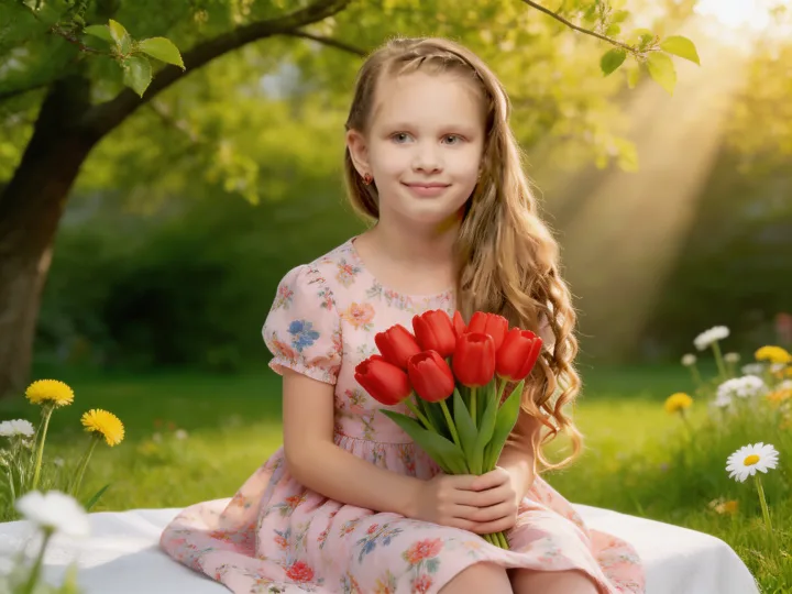 Фото девочки на 8 марта с красными тюльпанами передает нежность весны: легкое платье с цветочным принтом, уверенный акцент на букете и мягкий свет сада. Визуальная идея строится на теплом солнечном освещении, когда лучи проходят сквозь листву, а высокая резкость сохраняет фактуру лепестков и ткани.