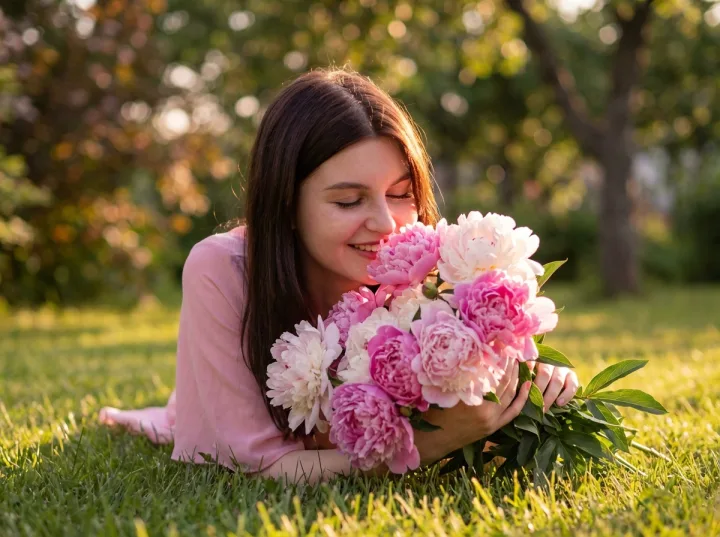 Используйте промпт с акцентом на позу на траве, крупный букет пионов и розовую гамму. Держите композицию ближе к уровню глаз и выбирайте фон с мягким размытием, чтобы внимание оставалось на эмоции и фактуре.