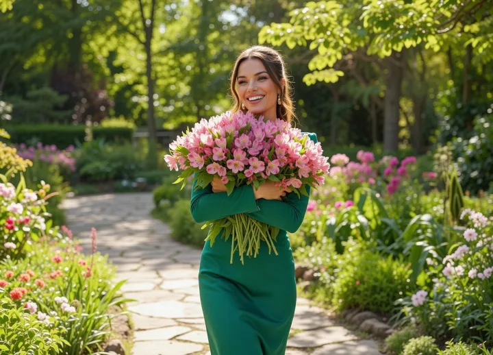 Фотография с букетом альстромерий передает легкость летней прогулки: героиня в зеленом платье идет по садовой тропинке и прижимает к себе розовые цветы. Сюжет помогает быстро задать настроение снимка и сделать букет главным акцентом, не перегружая фон.