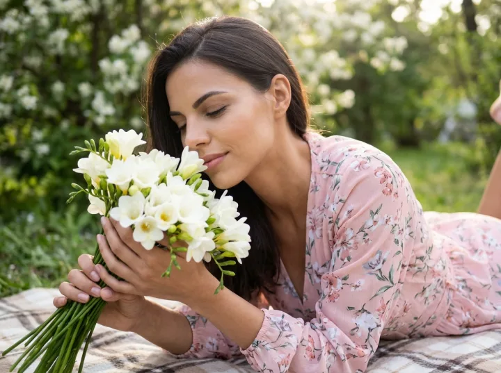 Портрет девушки с букетом фрезий передает тихую радость летнего пикника: пастельное платье, белые цветы и спокойный ритм сада создают чистую, светлую эмоцию без лишних акцентов.