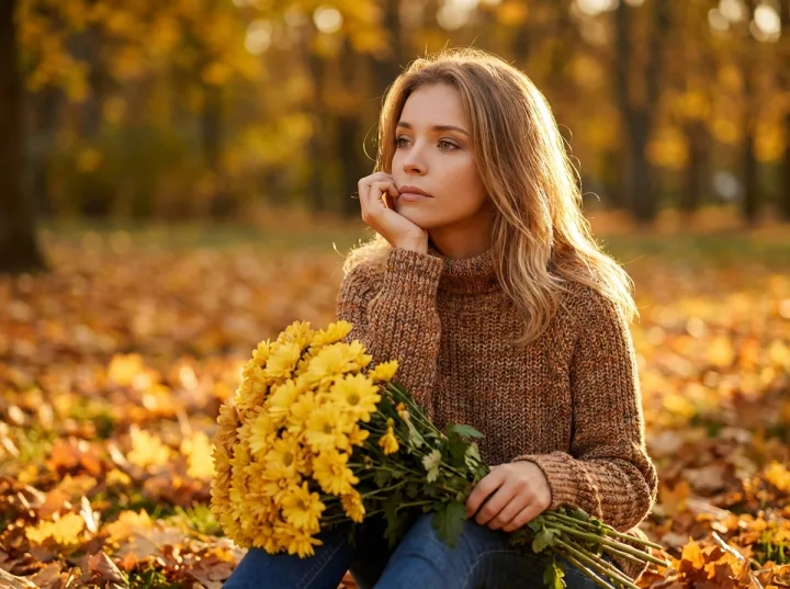 Теплая, спокойная сцена: девушка в вязаном свитере держит желтые хризантемы и растворяется в тишине парка среди опавших листьев. Настроение создает свет золотого часа, а мягкая передача фона подчеркивает задумчивый взгляд.