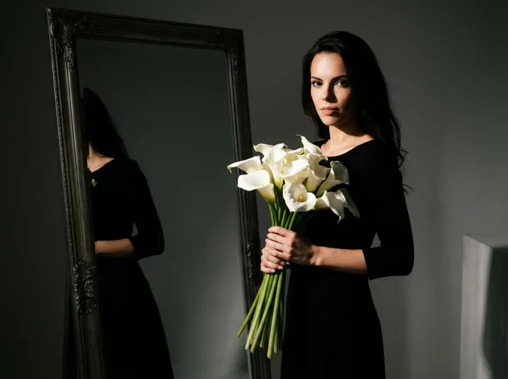 Добавьте в промпт: черное платье, белые каллы, зеркало в студии. Затем уточните направление света: боковой источник, жесткая тень, контроль бликов на цветах. Можно усилить образ указанием на минимализм и контраст, чтобы сохранить строгую, галерейную подачу.