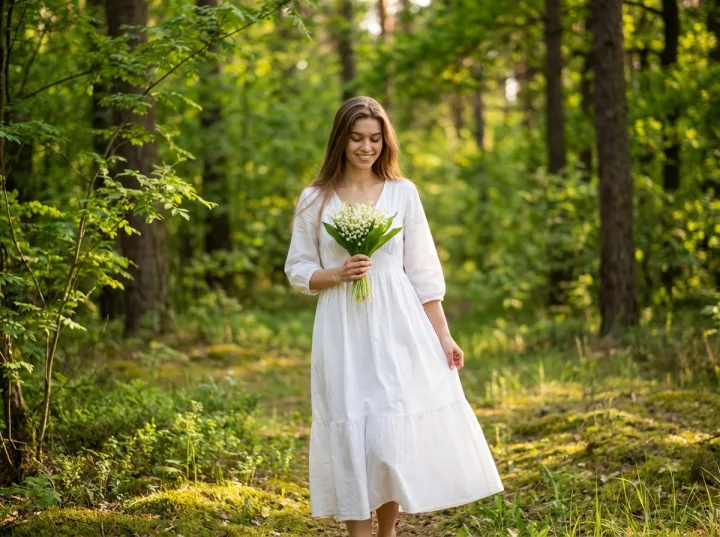 Снимок красавицы в белом платье с букетом ландышей передает тихую магию весны: белая ткань, хрупкие цветы и спокойная прогулка по лесной поляне. Мягкий лесной свет создает естественную глубину и подчеркивает зеленые тона без резких контрастов.