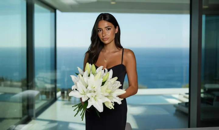 Красивый образ молодой леди с букетом лилий соединяет строгую элегантность и мягкую романтику: черное платье, белые цветы и спокойный взгляд на фоне океана. Композиция у панорамного окна до пола создает ощущение простора и дорогой тишины, а контраст светлого букета и темного силуэта сразу удерживает внимание.