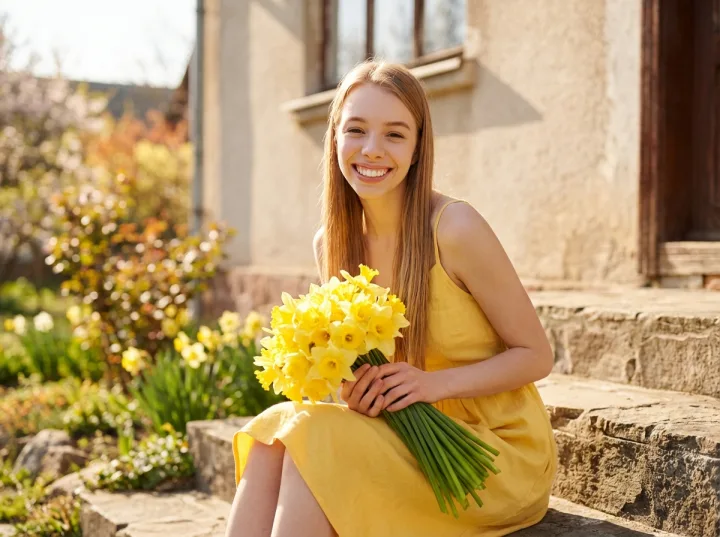 Красивый образ молодой девушки с букетом нарциссов задает тон весеннему портрету: легкость, тепло и искренняя радость. Композиция на ступеньках дома делает кадр живым и домашним, а желтое платье поддерживает цветочный акцент без перегруза.