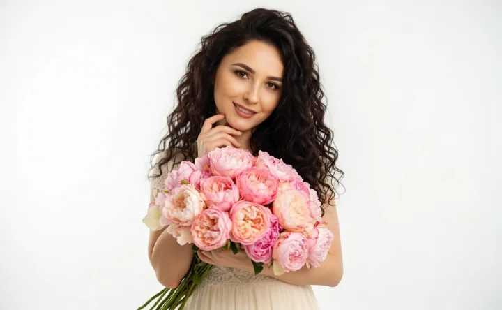 Фото девушки с букетом пионовидных роз раскрывает нежность портрета на белом фоне и делает цветы главным акцентом. Кремовое платье поддерживает мягкую палитру и подчеркивает романтичное настроение без лишних деталей.