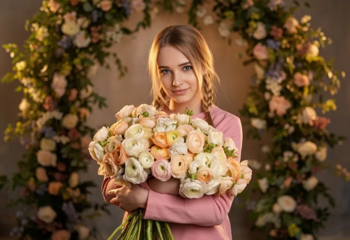 Фото девушки с букетом ранункулюсов передает мягкую весеннюю эстетику: розовый топ, цветочная арка и воздушная фактура лепестков создают образ, который легко применить в портретной и свадебной съемке.