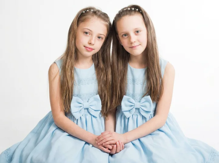 Фото красивого портрета 2 девочек в синих платьях передает спокойную нежность и доверие: одинаковые банты, близкая посадка и взгляд прямо в камеру создают чистую, семейную историю без лишних деталей.