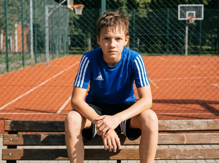 Фото для мальчика 10 лет на баскетбольном поле передает характер спортивного портрета: прямой взгляд в объектив, влажные после тренировки волосы и уверенная посадка на скамейке на фоне оранжевого покрытия площадки за сеткой. Сюжет читается мгновенно и работает на сильную эмоцию без лишних деталей.
