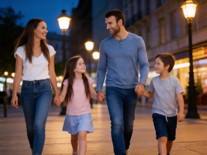 Семейное фото из 4 человек в вечернем городе помогает сохранить живые эмоции и ощущение совместной прогулки: легкая одежда, шаг в ногу, руки в руках и теплый свет улиц. Кадр строится вокруг движения, а городская среда становится естественными декорациями без постановочной жесткости.